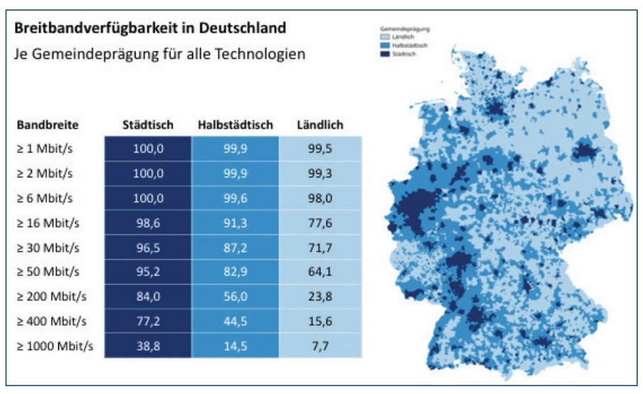 Neben diesem bemerkenswerten (wenn auch nicht ausnahmslosen) Ost-West-Gefälle lässt sich aber auch noch ein Gefälle zwischen Stadt und ländlichem Raum beobachten. Während in den Städten sämtliche Haushalte heute (rechnerisch zumindest) mehr als 6 MBit/s Downstream erhalten können und 84 Prozent mehr als 200 MBit/s-fähig sein sollen, sind es im ländlichen Raum gerade einmal 77,6 Prozent der Haushalte, die Zugriff auf eine 16-MBit-Leitung haben – und 200 MBit/s und mehr stehen gerade einmal für 23,8 Prozent zur Verfügung.
