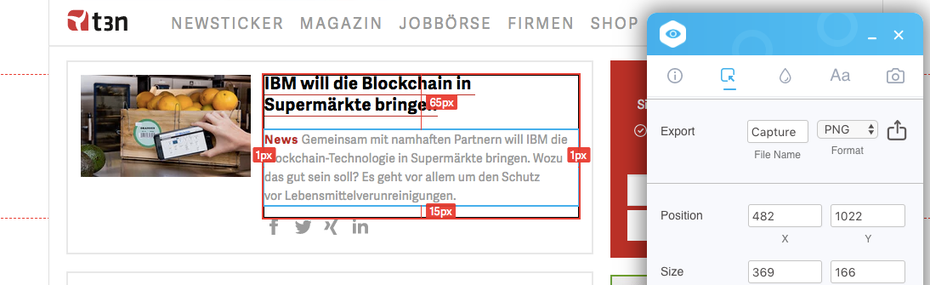 Die Erweiterung öffnet sich als schickes und selbsterklärendes Overlay, das besonders Designern gefallen könnte. Visual Inspector bietet unter anderem Möglichkeiten zum Inspizieren und Messen, auch von Farbe und Typografie. Außerdem lassen sich Design und Text editieren. Besonders praktisch ist das Exportieren der Änderung als PNG-Datei, so können Anpassungen schnell untereinander abgestimmt werden.