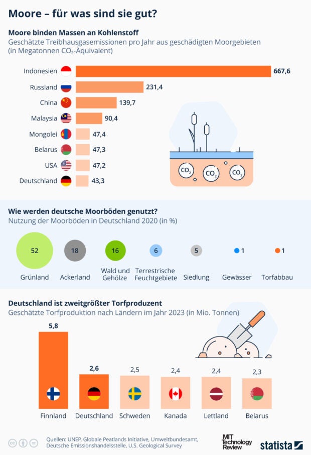 Deutschland zählt zu den acht Ländern, die am meisten Treibhausgase durch die Entwässerung von Mooren emittieren. Das zeigt die Statista-Infografik mit Daten der Globale Peatlands Initiative. Die meisten Emissionen stammen aus Indonesien, der EU und Russland. Innerhalb der Europäischen Union entfällt die Hälfte auf Deutschland, Finnland und Polen. Der weit überwiegende Teil dieser Emissionen stammt laut Quelle von landwirtschaftlich genutzten Flächen.