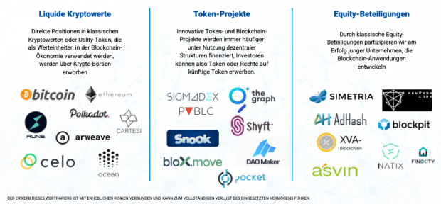 Unsere Aktie ist als langfristiges Investment gedacht. Wir empfehlen Anlegern auch nur einen kleinen Anteil – vielleicht ein bis fünf Prozent – eines gut diversifizierten Portfolios in Krypto zu investieren. So lässt sich die Volatilität gut aushalten. Unsere Aktie ist ein Angebot, breit an den Chancen der Blockchain-Innovation zu partizipieren. Auch für private Investoren, die, ohne viel über den Kryptomarkt zu wissen oder ein Cold Wallet und eine Exchange bedienen zu müssen, bequem über ihr Aktiendepot Geld in Krypto anlegen wollen. Wir haben ein diversifiziertes Portfolio, das das breite Spektrum der Blockchain-Technologie abbildet. Zudem haben wir durch unser Netzwerk privilegierten Zugang zu den Projekten und ein diverses Team aus DeFi-Experten und alten Hasen im Finanzmarkt, die diese Projekte bewerten können.