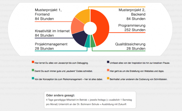 An einem Tag in der Woche wird das praktische Wissen durch Theorie vertieft. Dabei wird das klassische Programmieren durch Lernelemente aus Mediengestaltung und Kreativkonzeption ergänzt. Das Traineeprogramm hat das Ziel, angehende Programmierer auf die veränderten Anforderungen in der IT-Branche vorzubereiten.