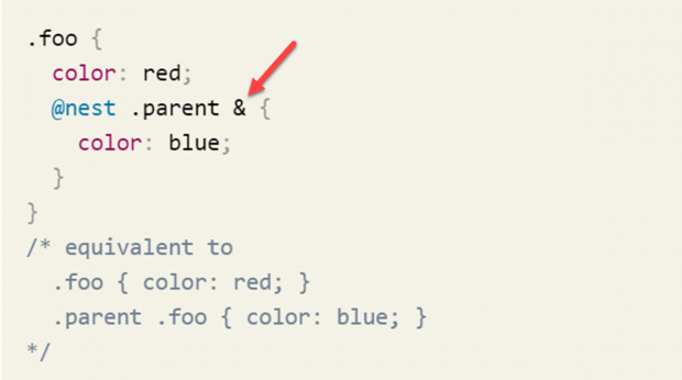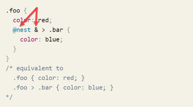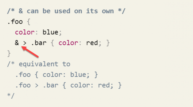 Zu diesem Zweck sieht die Spezifikation direktes und indirektes Verschachteln vor, wobei die indirekte Variante empfohlen ist, weil sie weniger Einschränkungen unterliegt und auch optisch im Code leichter zu unterscheiden ist. Das direkte Nesting soll erfolgen, indem dem zu verschachtelnden Selektor ein kaufmännisches Und (&), der eigentliche Nesting-Selektor, vorangestellt wird. Nutzer von Präprozessoren kennen das & als „Parent Selector“ oder „Parent Combinator“.