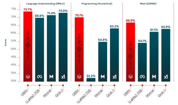 Laut den vom Unternehmen selbst veröffentlichten Benchmark-Ergebnissen schlägt DBRX die quelloffenen Konkurrenzmodelle wie Metas Llama 2, Mistrals Mixtra und Elon Musks Grok-1 teilweise deutlich.