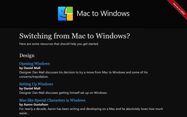 Aaron Gustafson, Webstandard- und Accessibility-Advocate bei Microsoft, hat die Website mactowindows.com erstellt, auf der Artikel zum Wechsel von Mac zu Windows zusammengetragen werden. Die Artikel sind in Kategorien unterteilt, wie etwa „Web Design“, „Opinions & Reactions“ und „Development“.