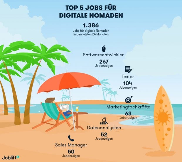 Allerdings profitieren nur wenige Arbeitgeber von der Beleibtheit des ortsunabhängigen Arbeitens. Joblift konnte in den letzten zwei Jahren zwar insgesamt 1.386 Stellenanzeigen erfassen, die sich an digitale Nomaden richten – das entspricht aber nur 0,01 Prozent aller ausgeschriebenen Stellen in diesem Zeitraum. Immerhin soll es in dem Zeitraum aber auch 178.749 Stellenausschreibungen gegeben haben, in denen zumindest für einen Teil der Arbeitszeit keine Präsenzpflicht besteht.