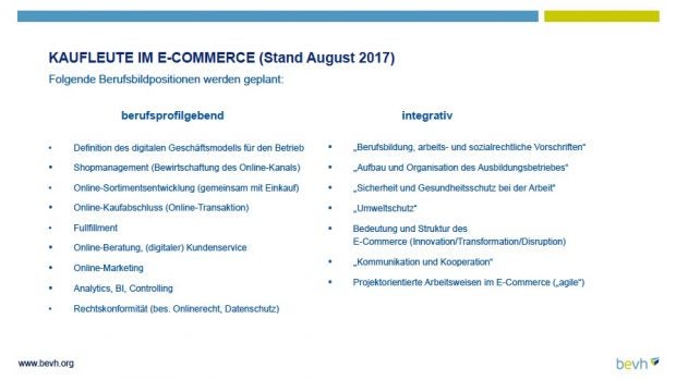 Der neue Beruf soll speziell für Schnittstellen-Funktionen qualifizieren und orientiert sich an der kaufmännischen, prozessorientierten Praxis im E-Commerce. Dabei werden bewusst Bereiche ausgeklammert, die in bestehenden Ausbildungsberufen einen besseren Schwerpunkt finden würden. Einkauf, Gestaltung/Fotografie, Printwerbung, Filialprozesse, Lagerorganisation oder Programmierung bleiben bei den bisherigen Fachleuten untergebracht. Der BEVH nennt als eines von vielen Beispielen für eine solche Schnittstellenfunktion einen Product-Owner für den Click-and-Collect-Prozess eines Händlers.