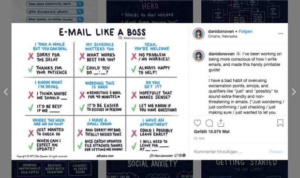 Doch nicht nur Hamblin hat dazugelernt und ist bereit, seine Erfahrungen zu teilen. Auch Dani Donovan, Designerin und Illustratorin, hat sich tiefergehend mit E-Mails beschäftigt. Auf ihrem Instagram-Account hat sie sich für typische Themen elegantere und zielführendere Formulierungen überlegt als die üblichen. Der Merkur hat über Donovon berichtet. Statt „Entschuldige die Verspätung“ bevorzugt sie nun beispielsweise den Satz „Danke für deine Geduld“. Damit will sie unterschwellig ausdrücken: „Ja, ich habe dich zwar vergessen, aber du kannst damit umgehen.“ Sie will so vermeiden, dass Vorwürfe in kommenden E-Mails endlos werden und signalisieren, dass sie ihren Fehler einsieht, es nun aber auch umso schneller vorangehen muss. Ein geschickter Stil.