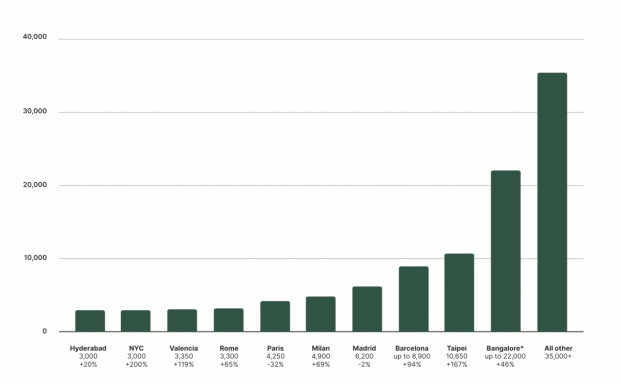Diese Platzierungen sind New York (plus 200 Prozent), Taipei (plus 167 Prozent) und Valencia (Plus 119 Prozent) vorbehalten. Auf den Plätzen dahinter folgen Barcelona, Mailand, Rom und Paris. Auch das indische Bangalore konnte deutlich zulegen.