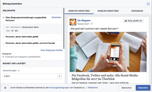 Mit dem Boosting-Button „Beitrag bewerben“ kannst du deine eigenen Beiträge direkt im Newsfeed oder auf deiner Seite per Klick bewerben, ohne auf den Werbeanzeigenmanager oder Power Editor zugreifen zu müssen. Die Anzeigenschaltung ist jedoch sehr stark begrenzt. Ein zielgruppengenaues Targeting – wie zum Beispiel auf Basis von Website Custom Audiences – ist nicht möglich. Aufgrund der eingeschränkten Möglichkeiten ist das Schalten performanter Werbung nahezu unmöglich. Kein Wunder, dass Experten wie Thomas Hutter und Florian Litterst von der Funktion abraten.