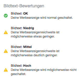 Einer der häufigsten Ablehnungsgründe für Anzeigen war stets die Text-Bild-Verteilung, da Facebook Motive bevorzugt, die maximal 20 Prozent Textanteil haben. Wenn du jetzt ein Anzeigenbild mit mehr als 20 Prozent Textanteil wählst und hochlädst, wird die Anzeige zwar freigegeben, jedoch deutlich weniger oder gar nicht von Facebook ausgespielt. Du bist dir unsicher, ob deine Anzeige zu viel Text enthält? Dann kannst du das ganz einfach mit dem Text-Overlay-Tool von Facebook herausfinden. Hier kannst du das Bild, das du verwenden möchtest, hochladen und erhältst sofort einen Hinweis darüber, ob der Textanteil im Bild „okay“, „niedrig“, „mittel“ oder „hoch“ ist.