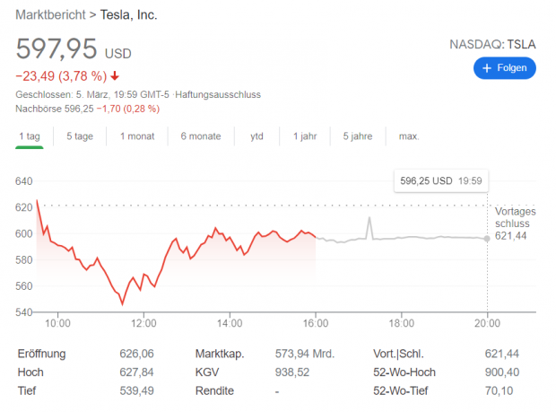 Tesla am Freitag: Der Dip ist klar erkennbar. (Screenshot: t3n)