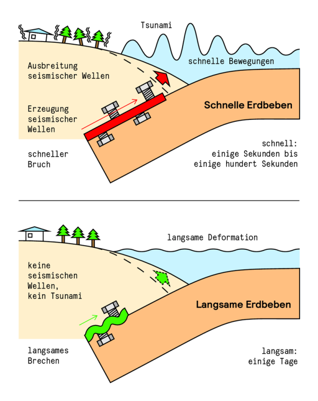 Schnelle Erdbeben entstehen dort, wo sich tektonische Platten gegeneinander bewegen. Langsame Erdbeben entwickeln sich unterhalb dieser Zonen durch gegenläufige Bewegungen der Erdkruste und gehen meist großen Beben voraus.