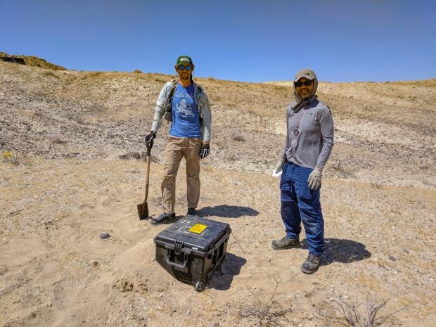 Forschende der USGS installierten 2019 Seismometer in der Nähe des Ridgecrest-Erdbebens, um Nachbeben aufzuzeichnen. Vom Seismometer ist nur noch ein kleiner Deckel im Boden zu sehen.