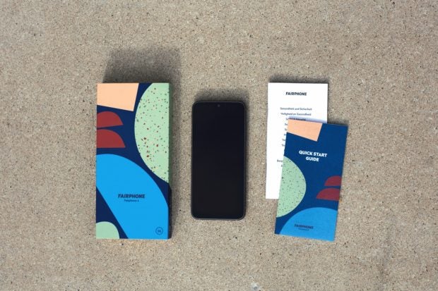 Das Fairphone 4 mit Box und Lieferumfang. (Foto: Fairphone)
