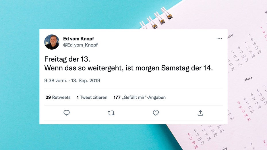Immerhin können wir uns aber auf eine Sache stets verlassen: Nämlich, dass Twitter-Nutzende diesen Tag nicht vorbeiziehen lassen, ohne ein paar witzige Tweets abzuschießen. Freitag, der 13., lockt so manch einen Scherzkeks hervor. Wir haben mal die Suchfunktion in dem Kurznachrichtendienst bedient und ein paar schöne Beispiele für euch kuratiert. Bleibt nur noch zu sagen: An alle Abergläubigen: viel Glück! An die anderen: happy Friday!