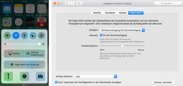 Night-Shift-Modus gegen zu viel Blaulicht auf Apple-Geräten einrichten. (Screenshot: t3n.de)