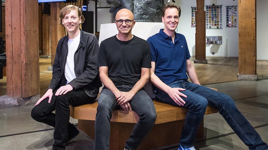 Github-Gründer Chris Wanstrath, Microsoft-Chef Satya Nadella und der künftige Github-CEO Nat Friedman. (Foto: Microsoft)