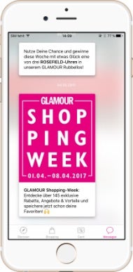 Über Nachrichten können Brands die Glamour-App-Nutzer auf Rabatt-Aktionen aufmerksam machen.