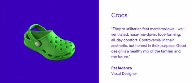 Designer Pat Iadanza hält Crocs für das ideale Design-Beispiel. Hier würde das Bekannte mit dem Neuen in idealer Weise vermischt. Herausgekommen seien nützliche Marshmallows für die Füße, die mit ihrer guten Belüftung für ganztägigen Tragekomfort sorgten. Sicher sei die Ästhetik kontrovers, aber gleichzeitig ehrlich.