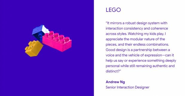 Für Interaktions-Designer Andrew Ng repräsentieren Lego-Bausteine das ideal gestaltete Produkt. Denn Lego sei in sich wieder ein Design-System, das es erlaube, viele verschiedene Designs zu erstellen, die dennoch in sich konsistent blieben.