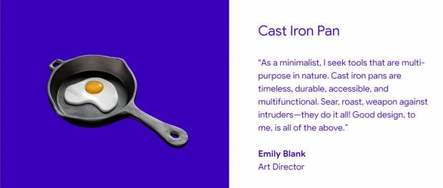 Die gusseiserne Bratpfanne ist für Art-Direktorin Emily Blank der Inbegriff guten Designs. Die Gestaltung sei zeitlos und praktisch unzerstörbar. Es gäbe keine Beschränkungen in der Nutzung und das Küchenwerkzeug sei zudem vielseitig einsetzbar, etwa als Waffe gegen Eindringlinge, so die Art-Direktorin.