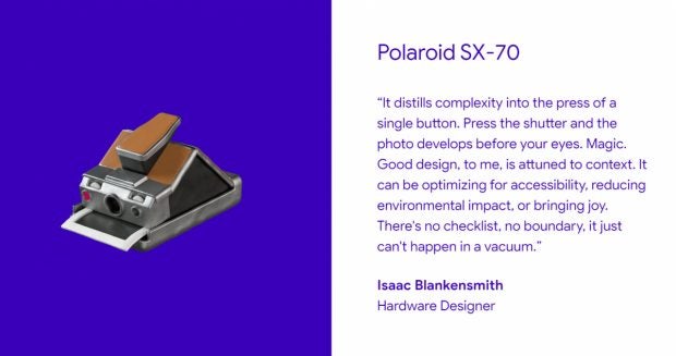 Produktdesigner Isaac Blankensmith zeigt sich besonders beeindruckt von der Polaroid-Sofortbildkamera, weil sie nur des Drucks eines einzelnen Knopfes bedarf, um ein Bild aufzunehmen und auf Papier auszugeben. Damit könnte das Produkt viele verschiedene Kontexte bedienen und sei es nur der, Freude zu vermitteln.