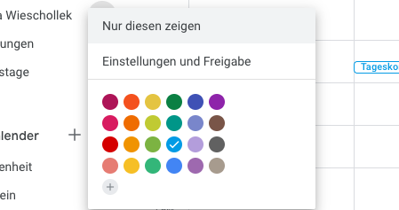 Es gibt Termine und Termine – seien sie privater Natur, beruflicher, beim Arzt, Sport … Um sie auf einen Blick unterscheiden zu können, kannst du jedem deiner Kalender eine eigene Farbe zuweisen. Rot für die Arbeit, Grün für den Sport, Blau für Ärzt:innen – ganz wie du willst. Dazu klickst du auf die drei Punkte, die erscheinen, wenn du links in der Kalenderansicht über die einzelnen Kalender fährst.