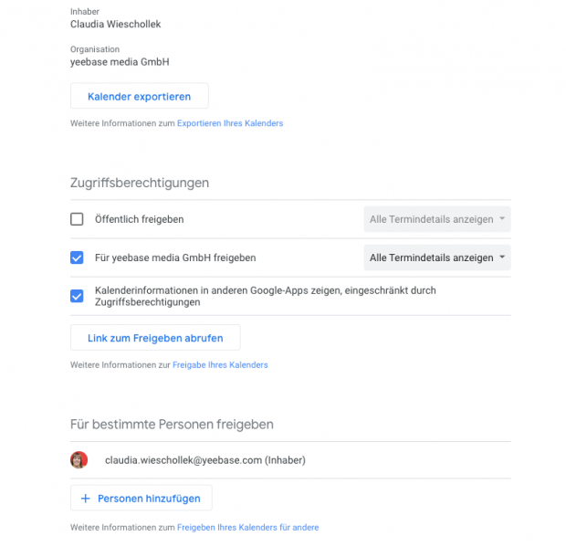 Natürlich kannst du deinen Google-Kalender auch mit deinen Kolleg:innen teilen. Dazu klickst in den Einstellungen auf den entsprechenden Kalender. Unter „Zugriffsberechtigungen für Termine“ kannst du jetzt bestimmen, ob dein Kalender öffentlich für alle sein soll oder beispielsweise nur innerhalb deiner Organisation. Auch einzelne Personen kannst du hier auswählen beziehungsweise per Mail einladen.