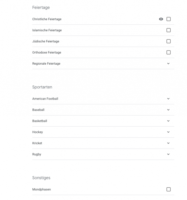 Der Google-Kalender kann dich übrigens auch an Feiertage in anderen Ländern, Sonnenauf- und -untergangszeiten oder den Spielplan deiner Lieblingsmannschaft erinnern. Das geht ganz einfach: In den Einstellungen wählst du links unter „Kalender hinzufügen“ Relevante Kalender ansehen aus – jetzt musst du dich nur noch entscheiden.