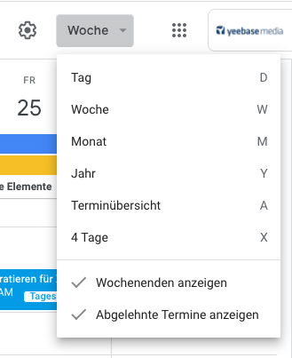 Fangen wir mit dem Offensichtlichsten an: Wie soll dein Google-Kalender aussehen? Tagesansicht, Wochenansicht oder gleich der ganze Monat oder das laufende Jahr – alles kein Problem, wenn du in der Browseransicht einfach folgende Buchstaben eintippst: