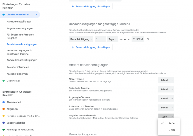 Du willst morgens direkt wissen, was für den restlichen Tag ansteht, kannst dir aber keinen Personal Assistant leisten? Kein Problem, der Google-Kalender macht das für dich. In den Einstellungen wählst du links den betreffenden Kalender aus, für den du die tägliche Terminübersicht haben willst, und klickst auf Terminbenachrichtigungen. Jetzt noch fix bei „tägliche Terminübersicht“ E-Mail auswählen und schon gibt es jeden Tag um 5 Uhr früh eine Nachricht vom Google-Kalender.
