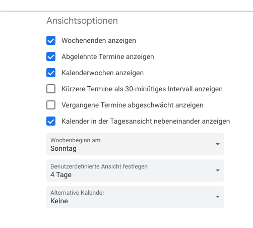 Was vorbei ist, ist vorbei. Richtig, und deshalb kannst du im Google-Kalender auch Termine, die in der Vergangenheit liegen, abgeschwächt anzeigen lassen. So bleibt dein Kalender übersichtlich. Dazu klickst du einfach in den Einstellungen auf Ansichtsoptionen und wählst Vergangene Termine abgeschwächt anzeigen aus. Workaholics können hier auch das Wochenende ausblenden.