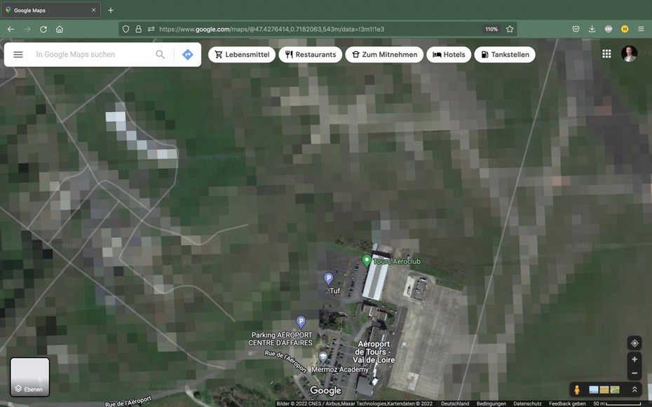 Beim französischen Luftwaffenstützpunkt in Tours kann man gerade einmal die Landebahnen erkennen. (Screenshot: Google Maps/ t3n.de)