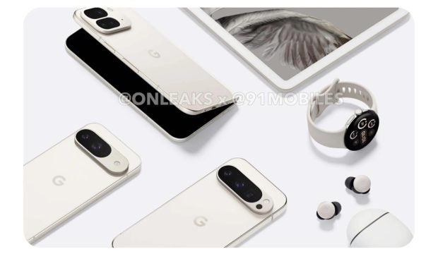 Die Smartphones kommen nicht allein: Laut einem offiziell anmutenden Promobild wird es neben Pixel 9 und dem Fold neue Uhren und Pixel Buds geben. (Bild: Onleaks)