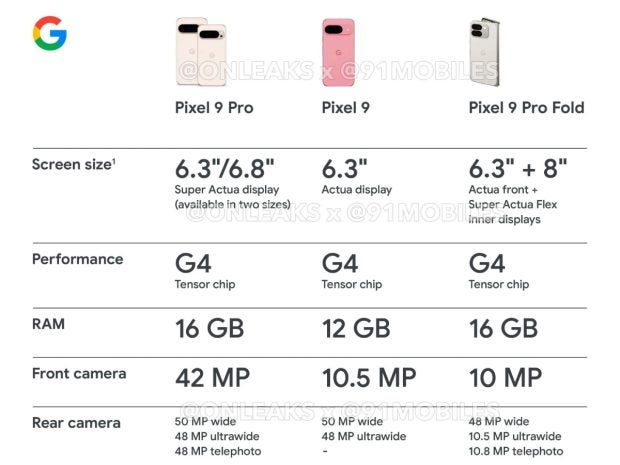 Das sollen die Eckdaten der Pixel-9-Modelle. (Bild: Onleaks)