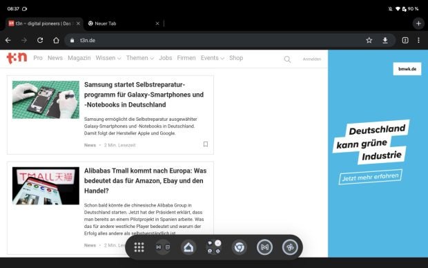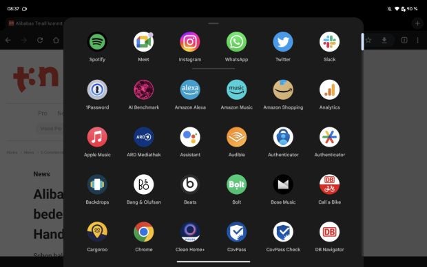 So sehen nicht optimierte Apps auf dem Pixel Tablet aus. Sie lassen sich im Querformat seitlich oder mittig mit einem Doppeltab positionieren. Im Hochkantformat werden die Apps bildschirmfüllend angezeigt: Wie auf einem riesigen Smartphone. (Screenshot: t3n)