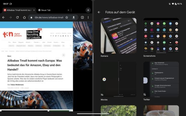 Google Pixel Tablet: Dank Split-Screen kann mit zwei Apps gleichzeitig gearbeitet werden – auch das Hin- und Herschieben von Dateien und Bildern ist möglich. (Screenshot: t3n)