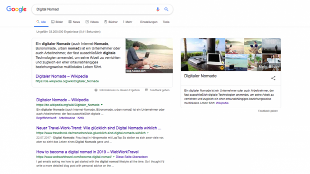 So sieht der Algorithmus den digitalen Nomaden. Inzwischen gehören zur Google-Suche sehr viel mehr Elemente als eine Liste blauer Links. (Screenshot: t3n)
