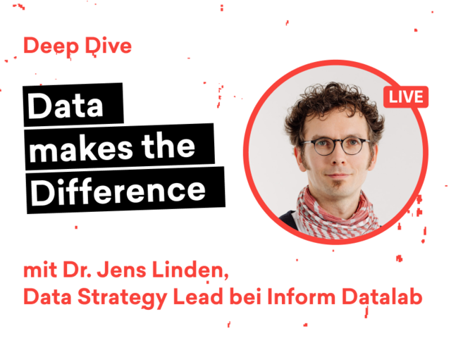 Am 13. Juni 2023 zeigt dir Dr. Jens Linden von Inform Datalab, was die Nutzung von Daten und Analytics alles kann. Inform Datalab ist ein Innovationszentrum, das sich mit der gesamten Datenwertschöpfungskette eines Unternehmens beschäftigt. Aus Daten Wissen und zielgerichtete Entscheidungen abzuleiten ist eine seiner Kernkompetenzen. Das Unternehmen hat sich mit seinem Beratungs- und Lösungsangebot auf das Thema Datenstrategie und Datenwertschöpfung fokussiert. Du hast beim Deep Dive mit Dr. Jens Linden also einen echten Experten an deiner Seite.
