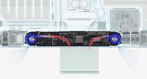 Die Kühlung des neuen iMac 24 wurde im Vergleich zum Vorgänger massiv verkleinert. (Screenshot: Apple/t3n)