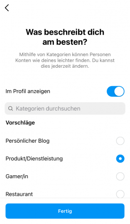 - Danach werdet ihr gefragt, was euch am besten beschreibt. Ihr könnt dafür selbst aus den Vorschlägen auswählen oder die Kategorien durchsuchen lassen. Sobald ihr etwas ausgewählt habt, erscheint die Option „Im Profil anzeigen“ – den Schieberegel daneben könnt ihr entweder auf blau, also auf „anzeigen“ stellen, oder ihr entscheidet euch dafür, die Kategorie nicht anzeigen zu lassen.