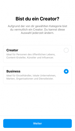 - Es öffnet sich möglicherweise ein neues Fenster, in dem ihr euch zwischen Business- und Creator-Profil entscheiden könnt. Diese Auswahl müsst ihr treffen, wenn Instagram die vorher gewählt Kategorie eher einem Creator als einem Unternehmen zuordnet. Ein Creator-Profil hat jedoch andere Funktionen als ein Business-Profil. Wenn ihr einen Business-Account erstellen wollt, solltet ihr natürlich „Business“ auswählen.