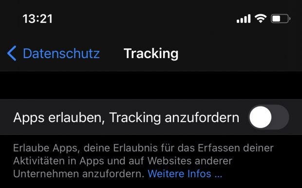 Schon vor dem Release von iOS 14.5 ließ sich das Tracking für alle Apps deaktivieren, indem ihr in den Datenschutzeinstellungen unter Tracking die Funktion „Apps erlauben, Tracking anzufordern“ deaktiviert habt. Die neu eingeführte Funktion erlaubt es euch nun, spezifischer zu sein und von App zu App einzeln festzulegen, welche Anwendung euch über die App-Grenzen hinweg auf Websites tracken darf.