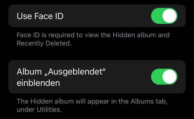 iOS 16 schützt eure versteckten und gelöschten Fotos per Face-ID-Authentifizierung. (Screenshot: t3n)