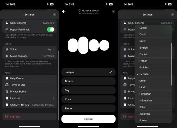 Bei der Sprachausgabe könnt ihr übrigens aus fünf verschiedenen Stimmen wählen, von denen drei eher weiblich und zwei männlich klingen. „Sky“ erinnert ein wenig an die Stimme von Scarlett Johansson. Ferner könnt ihr auch die jeweilige Sprache wählen. Englisch klingt derzeit noch weniger künstlich als die deutsche Sprachausgabe. Sämtliche Konversationen sind in der ChatGPT-App abrufbar.