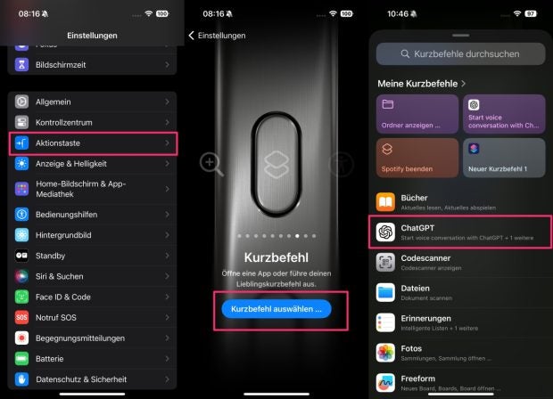 Mehr als ChatGPT Voice ist möglich: Apples Kurzbefehle-App ist in Kombination mit der Aktionstaste des iPhone 15 Pro ein Killerfeature. (Screenshots: t3n)