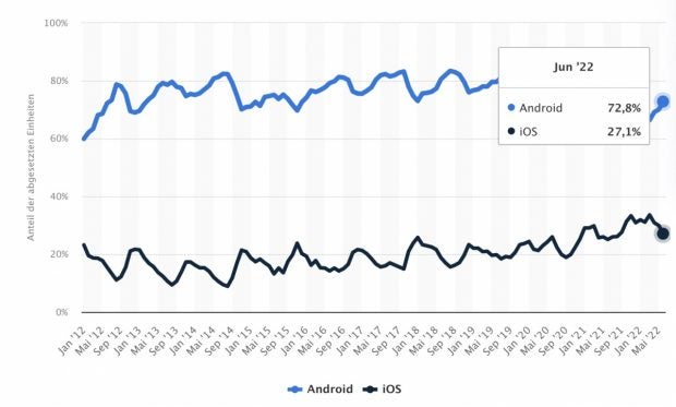 Laut Statista ist Android anhand der Absatzzahlen noch weiter vorn als nach den Daten von Statcounter: Im Juni 2022 lag der Marktanteil von Android bei über 70 Prozent, während iOS 27,8 Prozent erreichte.