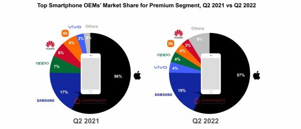 Andere Hersteller wie Samsung, Oppo oder Vivo erzielten 19 Prozent respektive 4 Prozent vom Markt. Unter Premium-Smartphones versteht Counterpoint Geräte, die 400 US-Dollar und mehr kosten.
