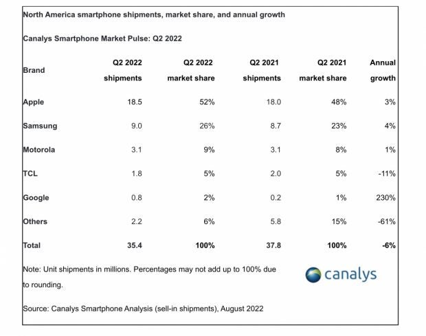 Während Counterpoint bei Apple einen Meilenstein verzeichnet, sieht es bei anderen Marktforschern anders aus. So stellt Canalys etwa dar, dass Apple schon seit drei Quartalen in Folge in Nordamerika den Markt dominiere. Konkrete Zahlen nur zu den USA liefern die Forscher nicht.