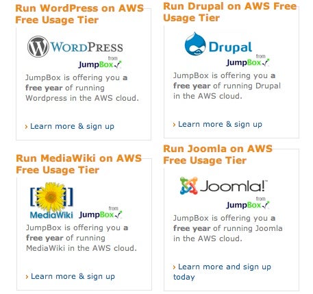 Möglich machen das die so genannten „JumpBoxes“, hinter denen sich vorkonfigurierte Installationspakete verstecken, die ein Nutzer mit nur einem Klick mit dem kostenlosen Cloud-Hosting-Angebot von Amazon verbinden kann. Aufwändige Installationsprozesse sind damit nicht mehr notwendig. Diese One-Click-Installations-Pakete gibt es für WordPress, Drupal, MediaWiki und Joomla. In Kombination mit dem kostenlosen AWS-Hosting-Angebot lassen sie sich auch ohne Lizenzgebühren nutzen.